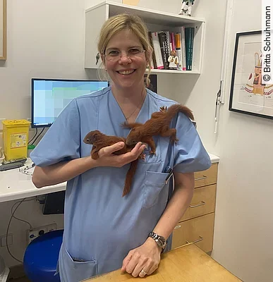Dr. Schuhmann: Gegenüber der Praxis liegt die Hochschule für Wirtschaft und Recht. Eines Tages kamen mehrere aufgeregte Studenten in die Praxis und baten uns zu helfen. Direkt in unserer Straße schaute ein Eichhörnchenkopf aus einem Gullideckel. Das Tier steckte dort fest, den Kopf auf der Straße und den Körper in der Kanalisation. Die Studenten trugen den Gullideckel in die Praxis (ein paar bewachten das offene Loch in der Straße), wir legten das Eichhörnchen direkt in Narkose und befreiten es mithilfe von viel Paraffinöl aus dem Gullideckel. Es erhielt Schmerzmittel und eine Infusion und blieb bei uns auf der Station. Nach 3 Tagen konnten wir „Gulliver“ wieder in die Freiheit entlassen.