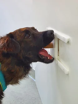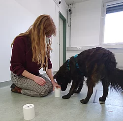 Die erste Studie im Rahmen meiner Promotion läuft gerade. Ich untersuche, inwieweit Priming-Ereignisse beeinflussen können, wie ein Hund die Handlungen seines Besitzers kopiert. Wir Menschen sind in hohem Maße auf soziales Lernen angewiesen, wenn wir jung sind. Wir beobachten und lernen von unseren Vorbildern wie unseren Eltern oder Lehrern. Menschen neigen sogar dazu, selbst irrelevante Handlungen, die Erwachsene vormachen, zu imitieren und zu kopieren. In meiner Studie wird dieses Verhalten bei Hunden untersucht, indem Hunde eine Aufmerksamkeitsaufgabe oder einen Beziehungstest absolvieren müssen, bevor sie sehen, wie ihr Besitzer eine Handlungssequenz vorführt. Diese Erfahrungen können Hunde auf bestimmte Kontexte vorbereiten und möglicherweise ihre Imitationsverhalten beeinflussen, so wie dies bei menschlichen Kindern der Fall war.