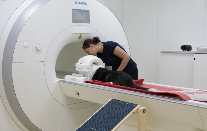 Ich untersuche die Mensch-Hund-Beziehung mit Hilfe von verschiedenen Methoden (Verhaltens-, Eye tracking- und MRT-Tests). Verhaltensstudien konnten zeigen, dass Hunde sich gegenüber ihren Haltern wie kleine Kinder gegenüber ihren Müttern verhalten. Sie zeigen z.B. bestimmte Bindungsverhalten in stressigen Situation wie bei der Trennung vom Halter oder weniger explorieren wenn eine fremde Person im Raum ist. Es war allerdings noch nicht bekannt, ob die Mensch-Hund-Beziehung auch auf neuronaler Ebene ähnlich zur Mutter-Kind-Bindung ist. Daher habe ich meinen Hunden nach dem aufwendigen Training für den eye-tracker und den MRT-Scanner kurze Videos von ihren Haltern und im Vergleich bekannte und unbekannte Personen gezeigt und konnte feststellen, dass bei der Betrachtung der Halter die Hunde ähnlich wie bei Menschen Hirnareale aktiviert waren, die mit Emotionsverarbeitung und Bindung zusammenhängen. Zudem haben sie ihre Halter im eye-tracker etwas länger angesehen, welches ebenfalls auf eine übergeordnete Rolle der Halter im Leben der Hunde hinweist.