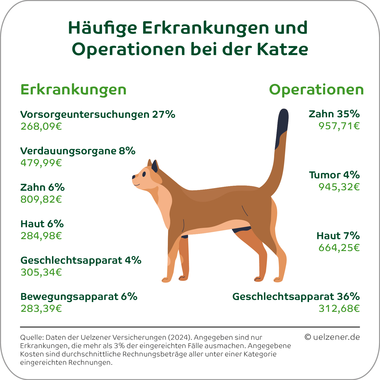 Ob Stubentiger oder Freigänger – Katzen gelten als robust und widerstandsfähig. Dennoch bleiben sie nicht von Krankheiten oder Verletzungen verschont. Welche gesundheitlichen Probleme bei Katzen besonders häufig auftreten, haben die Uelzener Versicherungen aktuell untersucht. Basis der Analyse sind eingereichte Tierarztrechnungen aus dem Jahr 2024. Die Daten von insgesamt 63.000 versicherten Katzen zeigen, welche Eingriffe und Behandlungen vergleichsweise oft vorkommen und mit welchen Kosten zu rechnen ist. Berücksichtigt wurden Erkrankungen und Operationen, die mehr als 3 % der eingereichten Fälle ausmachen.