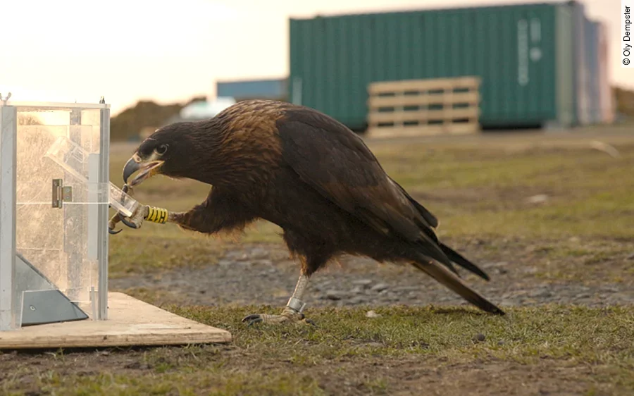 Bei Falken würde man nicht an einen Vogel denken, der mit voller Geschwindigkeit auf eine mit Spielen bestückte Kunststoffbox zuläuft. Aber Falklandkarakaras sind anders und stellen die Definition von „Falken“ gewissermaßen auf den Kopf. Johnny Rooks, wie die Wildvögel lokal genannt werden, strandeten auf den Flaklandinseln, umgeben von Ozean und starken Winden und in Unsicherheit darüber, wann und wo sie ihre nächste Mahlzeit finden werden. Sie brauchen eine Denkweise, die ihnen hilft, diese Herausforderungen zu bewältigen. „Falklandkarakaras müssen einen starken Erkundungsdrang haben, und ständig neue Dinge in ihrer Umgebung untersuchen, um herauszufinden, was für sie funktioniert. Wobei handelt es sich um Futter? Was kann ich mit unterschiedlichen Materialien machen? Es erfordert eine gewisse kreative Tapferkeit, um auf den Falklands zu überleben,“ fügt Katie Harrington hinzu.