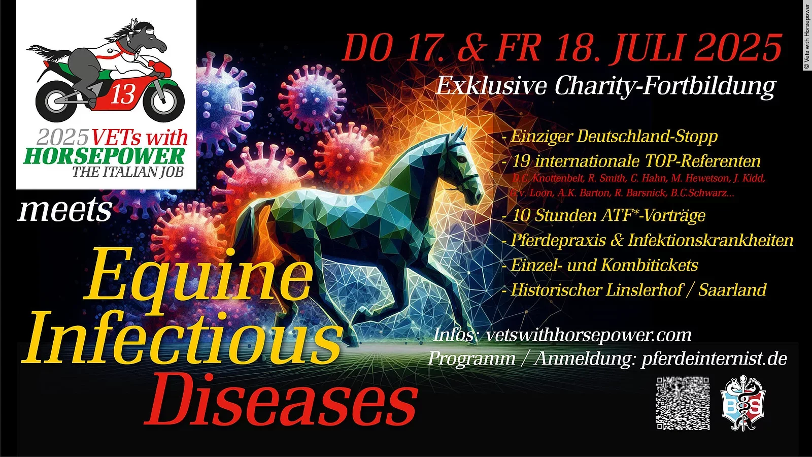 Am Donnerstag, den 17.07.2025 und Freitag, den 18.07.2025 findet am Linslerhof im Saarland die Fortbildung „Vets with Horsepower“ meets „Equine Infectious Diseases“ statt. Für die Fortbildungsveranstaltung sind 10 ATF-Stunden beantragt.