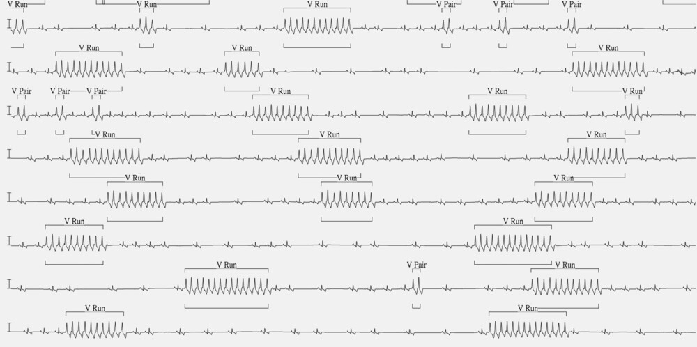 Die arrhythmogene rechtsventrikuläre Kardiomyopathie des Boxers (ARVC oder früher auch Boxer-Kardiomyopathie genannt) kann in verschiedenen Formen auftreten, 2 davon sind primär von ventrikulären Arrhythmien gekennzeichnet. Diese entstehen im Normalfall durch Depolarisationen im rechten Ventrikel und weisen typischerweise ein Linksschenkelblock-Muster im EKG auf [24]. Mehr als 100 VES in 24 h und frequente komplexe ventrikuläre Arrhythmien, wie z.B. Couplets, Triplets, Bigemini oder VTac, sind verdächtig für eine ARVC beim Boxer [28]. Bei mehr als 1000 VES in 24 h ist die Diagnose bestätigt (Abb. 1).