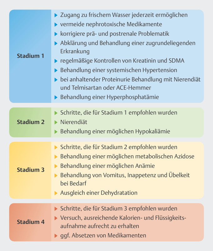 Die Therapieempfehlungen für die Stadien 1 – 4 folgen den Guidelines der IRIS (International Renal Interest Society) [1].