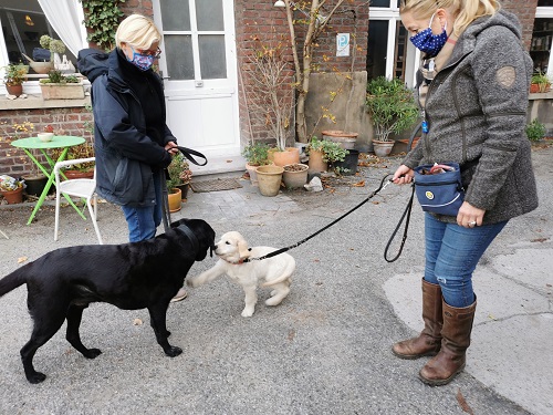 Im Sinne der sozialen Schulung gilt ganz Ähnliches für Hundekontakte. Denn auch hier zählt im Hinblick auf die Entwicklung des Welpen nicht allein die Anzahl an Hundekontakten, sondern vielmehr deren Qualität bzw. das emotionale Erleben des Welpen. Bekanntschaften mit guten Lehrmeistern (freundliche, souveräne und wohlerzogene Hunde) sind Gold wert. Damit diese häufig genug stattfinden können, sind gezielte Verabredungen zurzeit die beste Wahl. Natürlich können diese – sofern es bei der Umsetzung keine Beschränkungen (mehr) gibt – auch in einer mit Bedacht organisierten und fachkundig angeleiteten Trainingsgruppe stattfinden. Das Lernziel ist, den Welpen in ruhigem und höflichem Hundeverhalten zu schulen.
