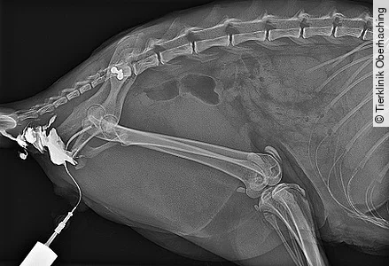 Abbildung 2: Kontrastmitteldarstellung der Urethra bei einer Katze mit multiplen Beckenfrakturen