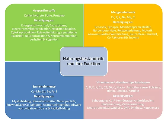Bekannterweise lassen sich die Nährstoffe für unseren Körper in erster Linie in Proteine, Fette und Kohlenhydrate unterteilen. Doch daneben spielen auch die Mengen- und Spurenelemente sowie viele verschiedene Vitamine eine unabdingbare Rolle – auch im Gehirnstoffwechsel. Welche Nährstoffe für welche Struktur und Funktion des Gehirns wichtig sind, stellt die Übersicht grafisch nach Nährstoffgruppen dar: