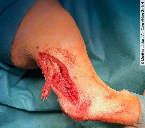 Auch bei partiellen Rupturen mit Hyperflexion des Tarsus ist eine operative Versorgung indiziert. Das Ziel dabei ist der Schutz der Sehne durch Fixierung des Tarsalgelenks in Extension.