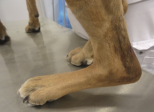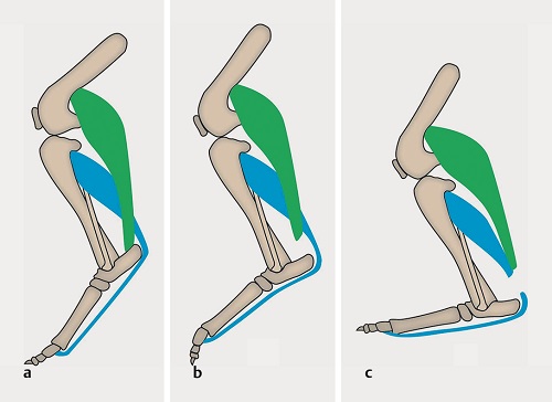 Klinisch kann – im Vergleich zur vollständigen Ruptur – eine weniger ausgeprägte Hyperflexion des Tarsokruralgelenkes bei Hyperextension des Knies mit moderater plantigrader Fußung beobachtet werden. Bei intakter Sehne des M. flexor digitorum superficialis und Ruptur der Sehne des M. gastrocnemius sowie der Sehnen des M. gracilis, des M. semitendinosus und des M. biceps femoris, weisen die Zehen ein pathognomonisch klinisches Bild auf: Die Zehen zeigen eine Hyperflexion, da die unverletzte oberflächliche Zehenbeugersehne bei Hyperflexion des Tarsokruralgelenkes eine Flexion der Zehen bedingt ([Abb. 2].