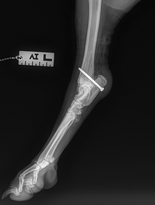 Eine Studie mit 45 Hunden beinhaltete 38 Fälle, bei denen die Immobilisation durch eine calcaneotibiale Schraube durchgeführt wurde und wovon lediglich 3 Patienten Komplikationen mit gebrochenen oder gebogenen Schrauben zeigten. Bei 37 Patienten wurde zusätzlich ein 6-wöchiger Castverband genutzt, bei einem Patienten ein Fixateur externe. Die Schraube wurde 6 Wochen post operationem mittels Schnittinzision entfernt und folgend eine Verbandstherapie von 10 Tagen angeschlossen. Es empfiehlt sich, die calcaneotibiale Schraube etwas nach kranial zu bohren, sodass im Falle eines Bruches die Schraubenfragmente minimalinvasiv von kranial und kaudal entfernt werden können.