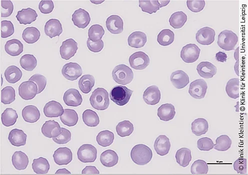 Im Blutausstrich werden häufig kernhaltige Erythrozyten nachgewiesen (nRBC, (Abb. 1)). Im Gegensatz zum Menschen ist dies eine Besonderheit beim Hund und wird wahrscheinlich durch direkte thermische Zytotoxizität im Knochenmark hervorgerufen. Ferner korreliert die Menge der nRBC mit der Rate an sekundären Komplikationen und kann als prognostischer Faktor hinzugezogen werden. Die Autoren dieser Studie geben unterschiedliche Cut-Off-Points an, je nachdem, welche Sensitivität oder Spezifität von Interesse ist [1].