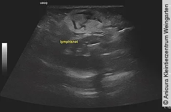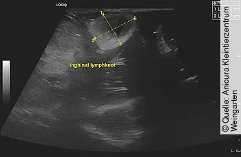 Auch im Ultraschall wurde im Inguinalbereich eine hypoechogene, rundförmige Struktur mit ca. 1,5 × 2 cm Durchmesser festgestellt und als Lymphknoten klassifiziert. Der Patient wurde daraufhin mit Alfaxan Multidose (Fa. Jurox) in einer Dosierung von 4 mg/kg i. v. sediert und es wurden Feinnadelaspirationen des Lymphknotens sowie von Milz, Leber und dem mesenterialen Lymphknoten durchgeführt.