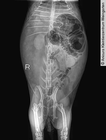 Es wurden am unsedierten Patienten jeweils Röntgenaufnahmen in latero-lateraler und ventro-dorsaler Projektion angefertigt, dabei stellte sich der Magen-Darm-Trakt inhomogen und mit kleinen Luftblasen durchsetzt dar. Der Magen zeigte einen geringgradigen Füllungsstand ohne Gasansammlung; sowohl Pylorus als auch Dünndarm wiesen keine pathologischen Veränderungen auf. Das Zäkum war hochgradig dilatiert und im linken Abdomen positioniert. Leber, Milz und Nieren lagen in ihrer normalen anatomischen Position und waren ohne besonderen Befund.