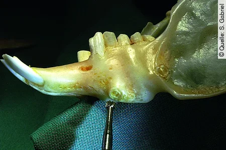 Im Unterkiefer besteht die Problematik, dass Detritus und Futterpartikel nicht abfließen können und die Wundheilung verhindern. Unterkieferabszesse können so nach Zahnextraktion durch Futterpartikel und Bakterien aus der Maulhöhle aufrechterhalten werden, wenn es nicht gelingt, die Alveole zum Ausgranulieren zu bringen. Dies ist besonders bei Extraktion oder Verlust mehrerer Molaren problematisch. Eine Tamponade mit resorbierbaren Materialien kann versucht werden, eine Patentlösung gibt es bislang jedoch noch nicht. So ergibt sich relativ häufig die frustrierende Situation, dass nach Backenzahnextraktionen im Unterkiefer zwar der Auslöser entfernt werden konnte, eine aufwändige Nachbehandlung allerdings folgen muss.