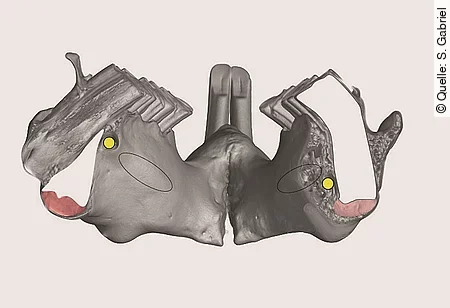 Häufig wird angefragt, ob man einen „störenden“ Backenzahn, z. B. wegen sublingualer Spitzenbildung, nicht einfach ziehen kann. Dazu ist zu bemerken, dass sich ein wurzelgesunder Molar nicht aus der Zahnreihe entfernen lässt, ohne die Nachbarzähne zu schädigen. Das gelingt höchstens bei den endständigen Molaren. Abb. [5] zeigt die bilophodonte Innenstruktur der Molaren. Dies bedeutet, dass ein zusammengesetzter elodonter Zahn aus 2 nebeneinander angeordneten und verbundenen Zahnkörpern besteht, von denen jeder ein eigenes Pulpenorgan besitzt.