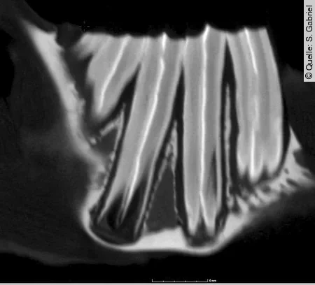 Eine überlagerungsfreie Darstellung aller Backenzähne ist am Schädel des Kleinsäugers nicht möglich. Daher müssen hochauflösende Röntgenbilder (Abb. [2]) bei standardisierter Lagerung in mehreren Ebenen angefertigt werden, um Zähne und Kiefer sicher beurteilen zu können. Die in diesem Artikel dargestellten CT-Bilder wurden experimentell mit einem Mikro-CT aus der Werkstoffprüfung an Knochenpräparaten angefertigt (Abb. [3]). Sie sind in ihrer Auflösung nicht mit den üblicherweise vorhandenen klinischen CT-Bildern vergleichbar. Gerade für die feinen und feinsten Veränderungen an Zähnen und Kiefern ist die klassische (Dental-)Röntgentechnik immer noch unübertroffen [[5]]. Zur isolierten Darstellung der Unterkieferäste wird eine Schrägprojektion mit einer Kippung von etwa 40° verwendet.