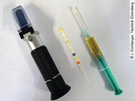 Die Urinuntersuchung kann wertvolle Informationen im Hinblick auf eine mögliche Nierenerkrankung liefern. Mithilfe des Refraktometers kann das Urin-spezifische Gewicht (USG) als Inhouse-Test bestimmt werden ([Abb. 1]). Das USG spiegelt die Gesamtkonzentration der gelösten Stoffe im Urin wider und wird durch die Anzahl und das Molekulargewicht der gelösten Partikel beeinflusst. Es reflektiert die Fähigkeit des renalen Tubulussystems, den Urin und darin enthaltende Partikel zu verdünnen oder auch zu konzentrieren. Bei der Interpretation sollten mögliche extra-renale Einflussfaktoren wie beispielsweise Glukosurie, Harnwegsinfektionen oder Blutkontamination berücksichtigt werden.