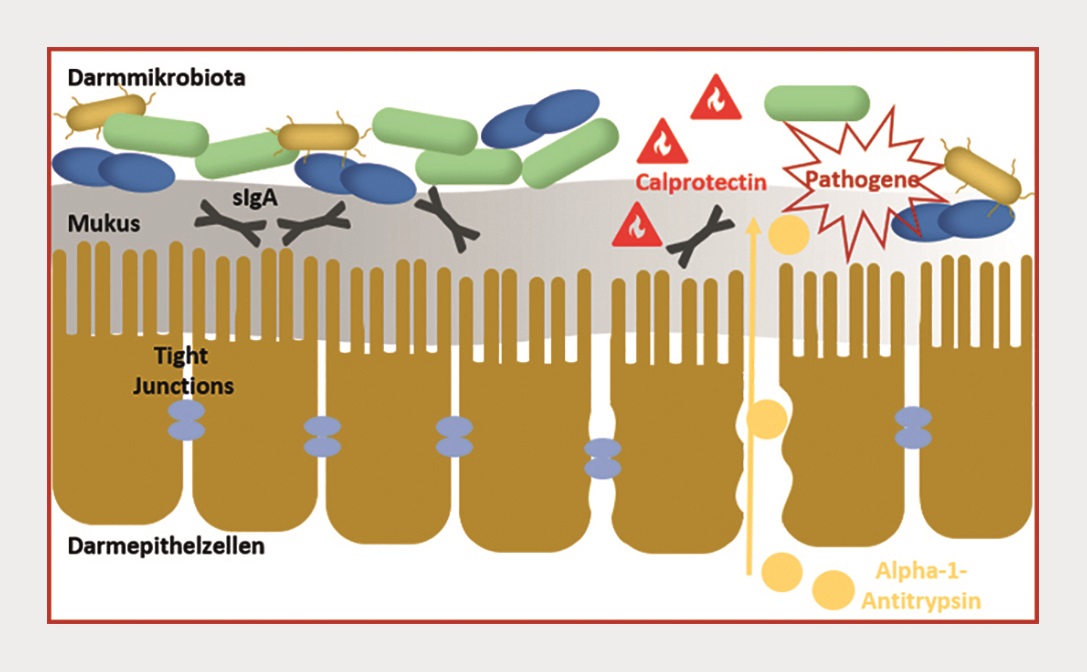 Die Dysbiose ist ein Zustand, bei dem das natürliche Gleichgewicht der Mikroorganismen in Regionen wie der Haut, den Schleimhäuten des Respirations- oder Urogenitaltrakts und im Darm gestört ist. Diese Störung kann zu einer Verringerung der natürlichen Schutzfunktionen des betroffenen Bereichs führen. Im Darm beispielsweise kann eine Dysbiose die Schutzbarriere schwächen, die normalerweise durch eine gesunde Darmflora, die Darmepithelzellen und ein effizientes darmassoziiertes Immunsystem gebildet wird. Die Konsequenzen sind oft eine erhöhte Anfälligkeit für Infektionen mit pathogenen Keimen wie Bakterien, Viren, Pilzen und Parasiten sowie eine erhöhte Durchlässigkeit der Schleimhäute ([Abb. 1]).