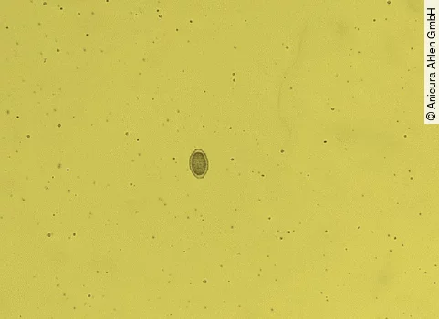 Als eine der einfachsten Untersuchungsmethoden folgt die Urinuntersuchung. Im Urinsediment können Eier des Parasiten nachgewiesen werden, sofern adulte Weibchen in der Niere vorhanden sind, was in bis zu 40% der Fälle vorkommt [15]. Die Eier von Dioctophyma renale messen 73-83μm in der Länge und 45-47μm in der Breite und sind damit verhältnismäßig groß im Vergleich zu anderen Nematodeneiern [4]. Charakteristisch ist die dicke Schale, die an den Längsseiten rau und an den Polen glatt und hell erscheint (Abb. 4 und 5). Damit gelingt eine gute Abgrenzung zu den Eiern von Capillaria plica, die als Begleitparasitose ebenfalls im Urin zu finden sein können (Abb. 6). Zusätzlich können im Urinsediment Entzündungsanzeichen wie Erythrozyten und Leukozyten vorhanden sein [11,15]. Aufgrund möglicher bakterieller Begleitinfektionen, sollte zudem eine bakteriologische Harnuntersuchung mit Antibiogramm erfolgen.