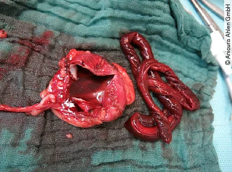 Hierzu erfolgt eine diagnostische Exploration der Abdominalhöhle hinsichtlich freier Flüssigkeit, Adhäsionen, etwaiger makroskopisch erkennbarer parasitärer Zysten oder adulter Stadien. Die betroffene rechte Niere hatte in dem hier vorgestellten Fall im fortgeschrittenen Krankheitsstadium trotz weitgehend konsumierten Verbrauchs des Parenchyms eine nahezu unveränderte Größe. Auffällig war eine ausgeprägt vermehrte kollaterale Gefäßversorgung retroperitonealen Ursprungs, welche als Folge einer beginnenden verminösen Perinephritis beziehungsweise als Kompensation einer auffällig obliterierten A. renalis gewertet wird. Neben der bipolaren Koagulation im Retroperitoneum erfolgt die Nephrektomie in typischer Weise mit Herauslösen der rechten Niere aus dem Nierenlager, Präparation des Nierenhilus mit Darstellung der A. und V. renalis, Ligatur derselben und Absetzen der Niere unter Mitnahme des Ureters.