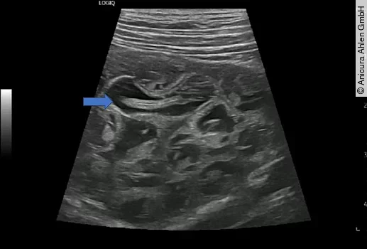 Eine weitere Methode zum Nachweis von Dioctophyma renale ist die Bildgebung. In der Röntgenuntersuchung kann unspezifisch eine Renomegalie der rechten Niere auffallen [11]. Die Sonographie ist spezifischer oder sogar, wie im hier vorliegenden Praxisfall diagnostisch (Abb. 7 und 8). Die rechte Niere stellt sich insgesamt vergrößert und durch sichtbaren Wurmbefall deformiert dar. Das Nierenparenchym verliert durch zunehmende Druckatrophie seine normale Architektur und wird ersetzt durch den/die wachsenden Parasiten und entzündliches Exsudat. Dies stellt sich sonographisch als multiple anechogene Rundherde mit hyperechogener Kapsel und darin doppellineare, tubuläre, mobile Strukturen dar [4,11,12,13].