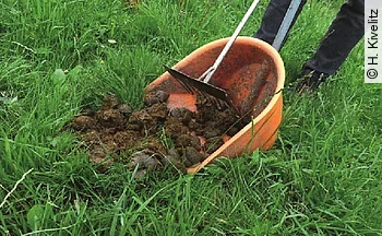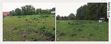 Während Rinder Gräser nur bis zu einer Pflanzenhöhe von etwa 3 cm abfressen, können Pferde Pflanzen bis unmittelbar über dem Boden verbeißen [Abb. 3]. Bei tiefem Verbiss wird bei den wertvollen Futtergräsern auch der Teilbereich abgefressen, wo ein Großteil der Nährstoffe eingelagert wird, die für die Regeneration erforderlich sind. Je häufiger während der Vegetationszeit Gräser sehr tief verbissen werden, desto stärker sind diese gestresst, regenerieren langsamer und sind dadurch weniger konkurrenzfähig oder können ganz absterben. Als Folge treten dann verstärkt Pflanzenarten bzw. Pflanzengesellschaften auf, die an einen intensiven Verbiss und Tritt bestens angepasst sind.