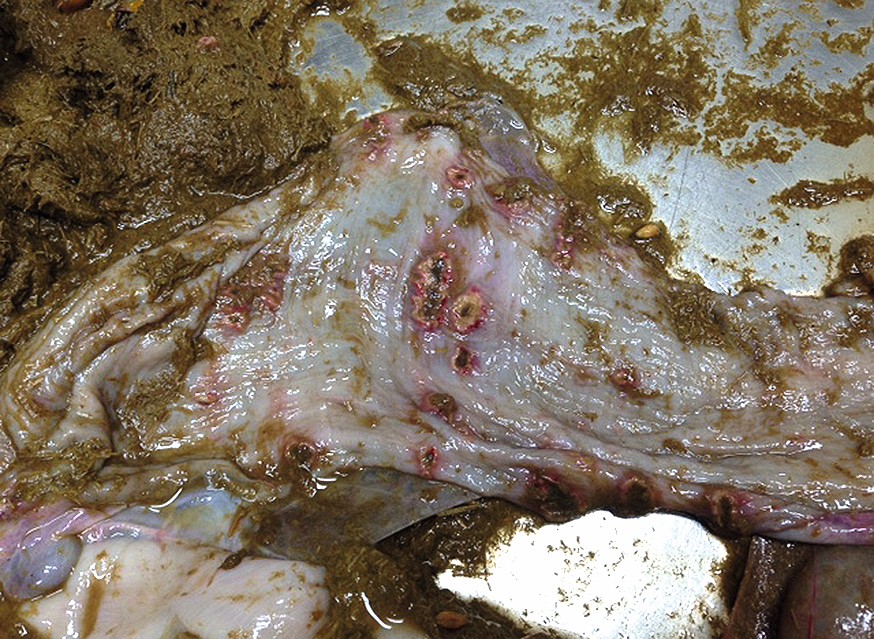 Ein Magenulkus wird bei vielen Tieren erst bei der Sektion als Haupt- oder Nebenbefund festgestellt, doch ein Ulkus gilt Literaturberichten zur Folge als häufige Krankheitsursache bei Neuweltkameliden. Es ist anzunehmen, dass Stress als eine der Hauptursachen für die Entstehung von Magenulzera anzusehen ist. Die Lokalisation von Magengeschwüren befindet sich überwiegend im kaudalen Bereich des dritten Kompartiments, ebenso in C1 und C2 und kann diagnostisch kaum erfasst werden, teilweise können auch im Darm Geschwüre auftreten (Abb. 2).