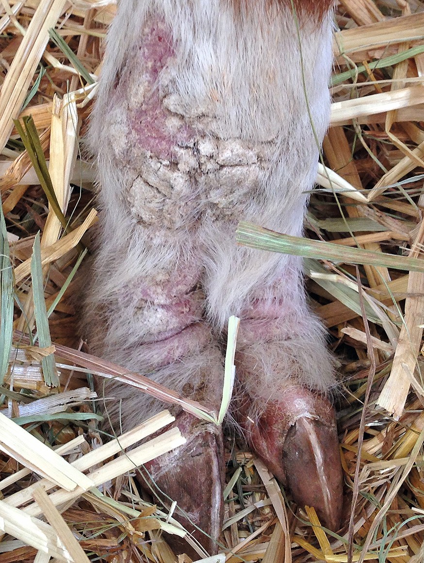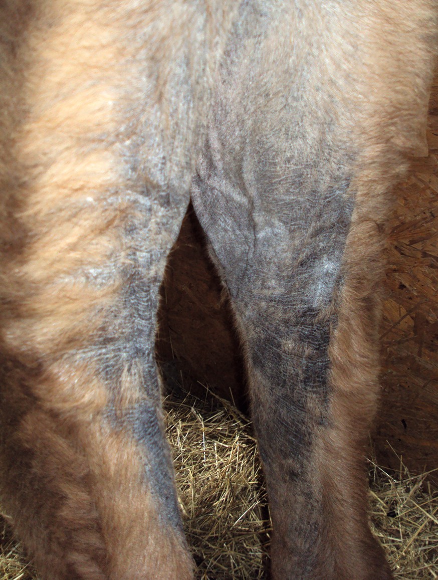 Ein Milbenbefall kann bei Neuweltkameliden (ebenso wie Zinkmangel) das Krankheitsbild der Hyperkeratose ausbilden. Hier steht vor allem der Befall mit Sarcoptes spp. und Chorioptes spp. im Vordergrund. Sarcoptes scabiei var. auchinae ist besonders zu erwähnen, da er auch auf den Menschen übergehen kann und somit ein Zoonosepotenzial besitzt. Sarkoptesmilben befinden sich vorrangig im Zwischenzehenbereich, im Bereich der Innenschenkel und des ventralen Abdomens. Psoroptesmilben sind vermehrt im Ohrbereich anzutreffen und rufen dann eine Ohrenentzündung (Otitis externa) hervor. Eine Ausbreitung dieser Milben auf den Rumpf ist ebenso möglich. Chorioptes spp. befallen vor allem Schwanz, Anus und den Bereich der Schenkelinnenseiten und den Zwischenzehenbereich (Abb. 4).
