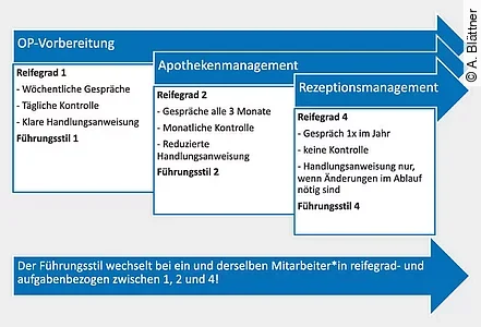 Wenn man diese Betrachtungsweise und Bewertungsmaßstäbe einsetzt, ist es sogar oft so, dass ein und derselbe Mitarbeiter*in bei verschiedenen Aufgaben unterschiedliche Reifegrade hat. Und daraus ergeben sich dann, auf zu erledigende Aufgaben bezogen, unterschiedliche Führungsbedürfnisse. So hat z. B. eine Person, die die Rezeption „schmeißt“, in dieser komplexen Aufgabe den Reifegrad 4. Würde man diese Person nun in die OP-Vorbereitung stecken, könnte es sein, dass sie hier einen Reifegrad 1 hat und für diese Aufgabe viel Anleitung, Wissensvermittlung und auch Kontrolle braucht.