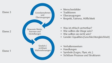 Für die Basis einer Analyse der Unternehmenskultur kann das 3-Ebenen-Modell der Organisationskultur von Edgar Schein verwendet werden (Abb. 1).